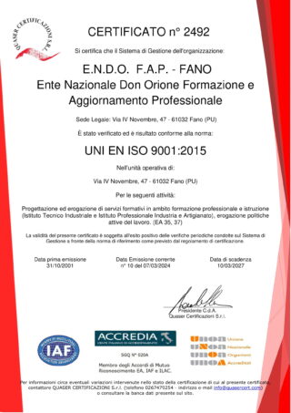 L’Istituto Tecnico Industriale “Don Luigi Orione” ha ottenuto fin dal 2001 un prestigioso riconoscimento di qualità. Un certificato di qualità ai sensi della normativa europea UNI EN ISO 9001:2015. La politica di qualità dell’Istituto è quella di offrire “al meglio” i propri servizi perché la scuola “operi con professionalità”.